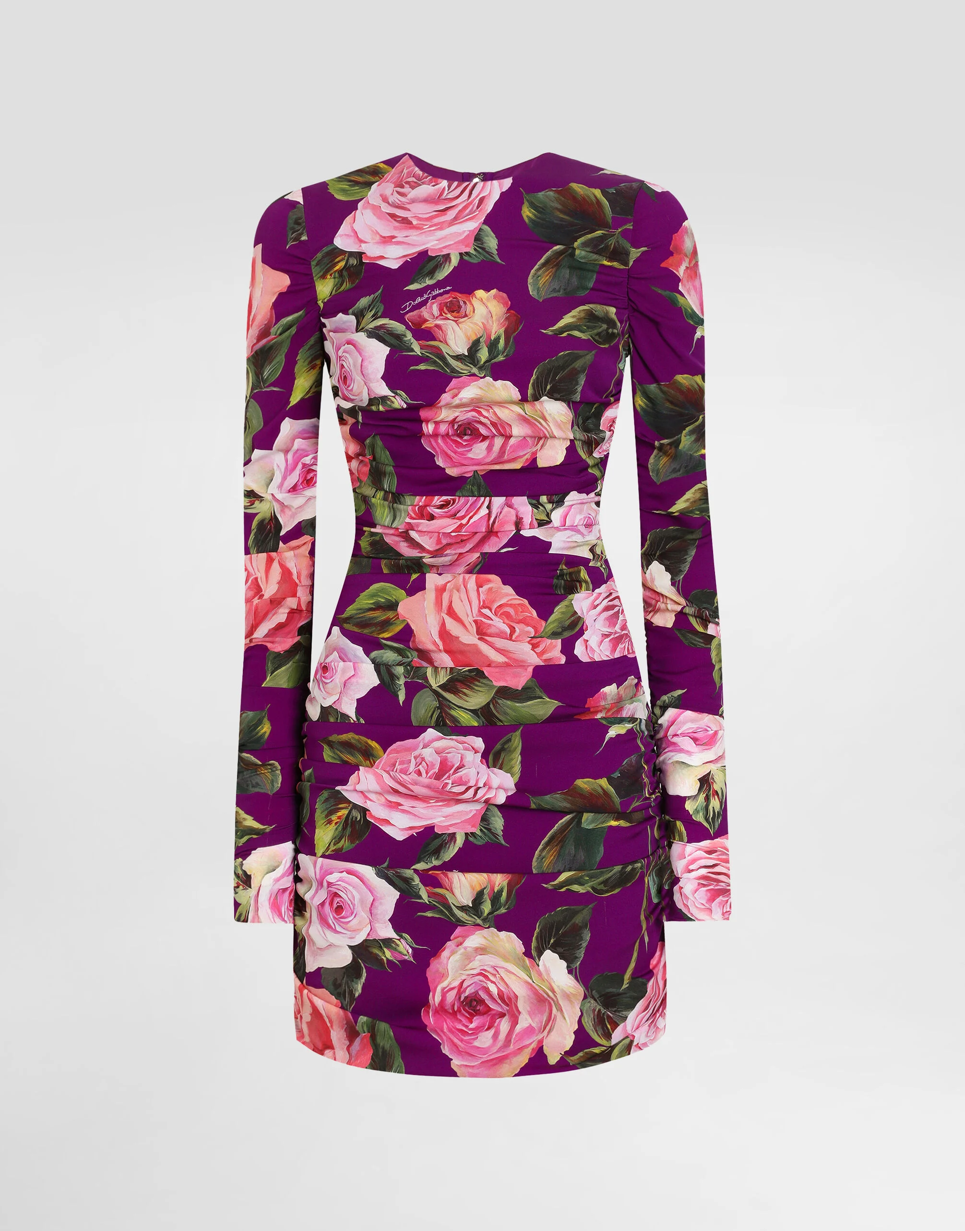 Stretch silk charmeuse midi sheath dress with draping and rose print: